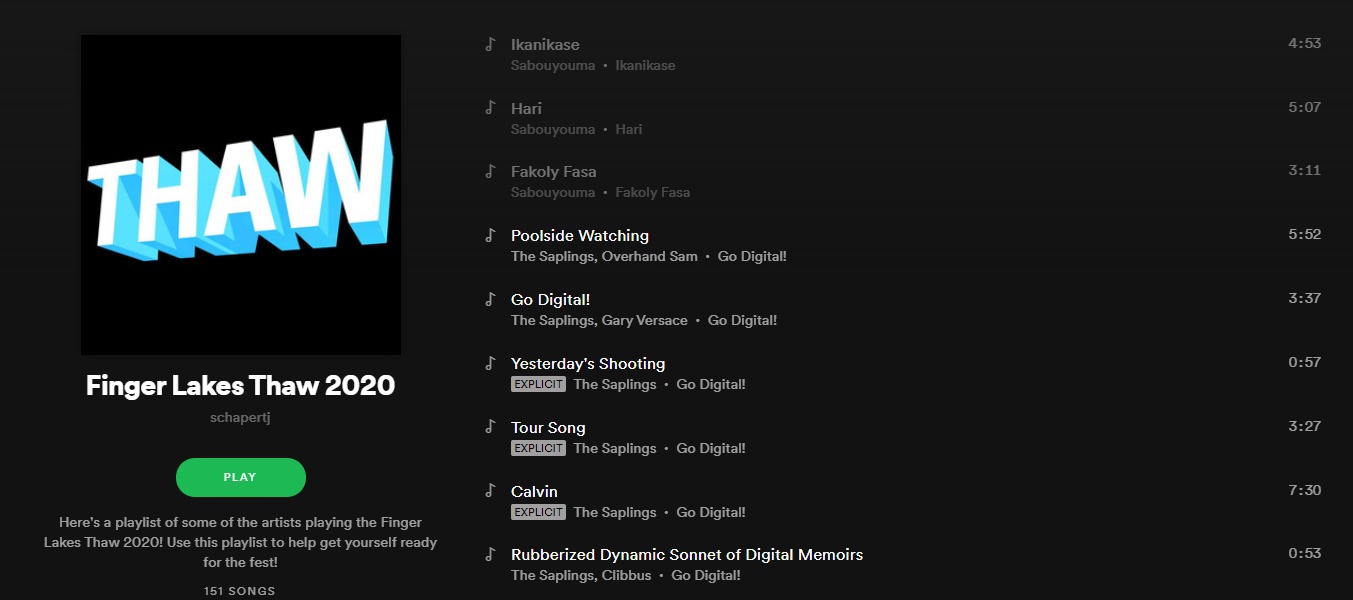 Playlists Finger Lakes Thaw 2020 Spotify Playlist By Mike Dzl, 23 January, 2020 Embed Tags Finger Lakes Thaw spotify playlist You may also like Playlists Grateful Dead's 5/8/77 performance at Cornell University's Barton Hall Playlists Marco Benevento - I'M A DJ TOO Playlists The GRAMMYs Official Spotify Playlist
